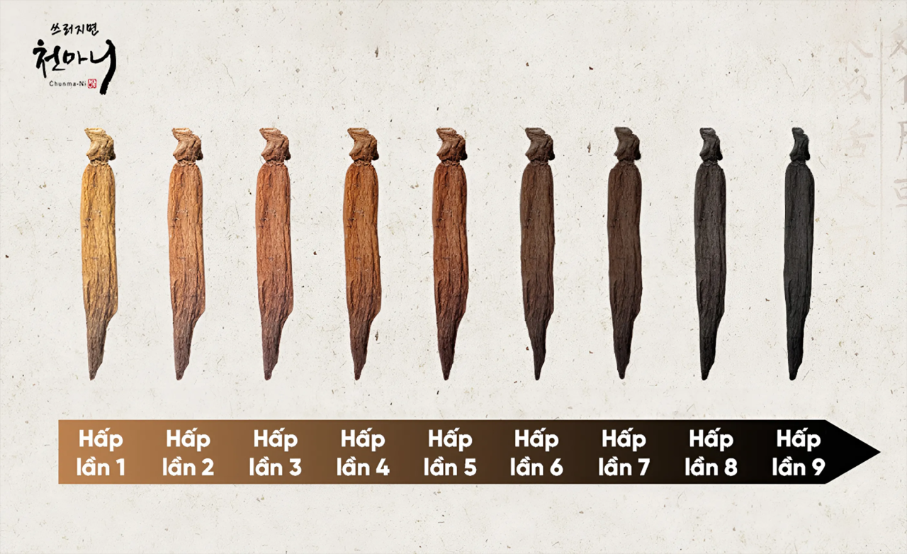 - Lý do hấp 9 lần sấy 9 lần :Bởi vì trong quá trình hấp 9 sấy 9 thành phần chính của nhân sâm, hàm lượng Ginsenoside tăng lên. Thành phần Ginsenoside (Rg3) giúp cải thiện mạch máu và tăng cường khả năng miễn dịch thông qua quá trình phân huỷ nhiệt làm cho lượng Ginseniside được tối ưu nhất