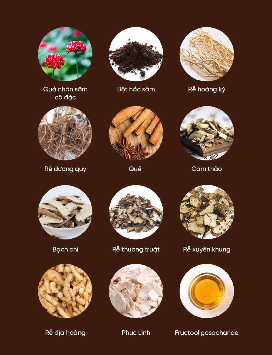 - Hồng sâm 6 năm tuổi cô đặc: là một thành phần đã được Bộ An Toàn Thực Phẩm và Dược Phẩm công nhận về khả năng tăng cường hệ miễn dịch, cải thiện mệt mỏi, có tác dụng chống oxy hoá, cải thiện tuần hoàn máu bằng cách ức chế kết tập tiểu cầu và cải thiện trí nhớ. Hồng sâm ức chế sự hấp thụ đường trong máu, cân bằng hoạt động của các enzym liên quan đến chuyển hoá đường. Hơn nữa, hồng sâm giàu Saponin giúp ngăn chặn sự di căn của các tế bào ung thư