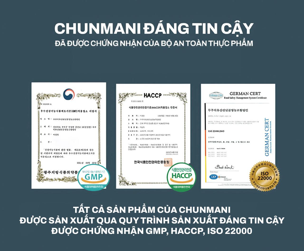 - Nhà máy sản xuất Chunmani: Với hơn 23 năm trong lĩnh vực sản xuất và thực phẩm bảo vệ sức khỏe. Chunmani đã xây dựng một quy trình sản xuất nghiêm ngặt và tuân thủ các tiêu chuẩn cao.