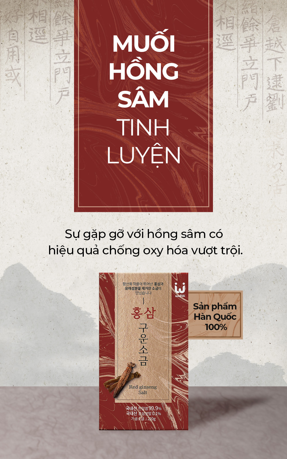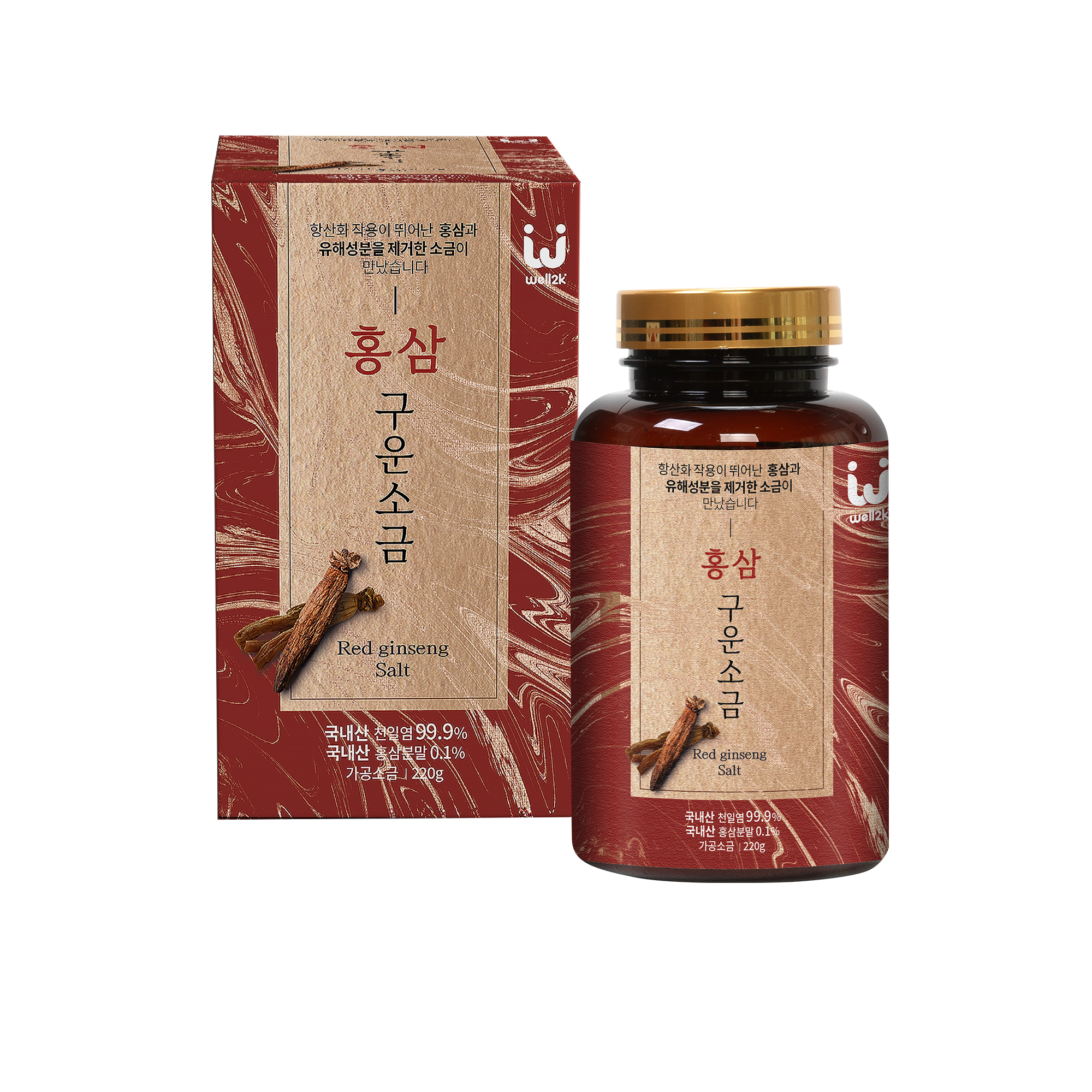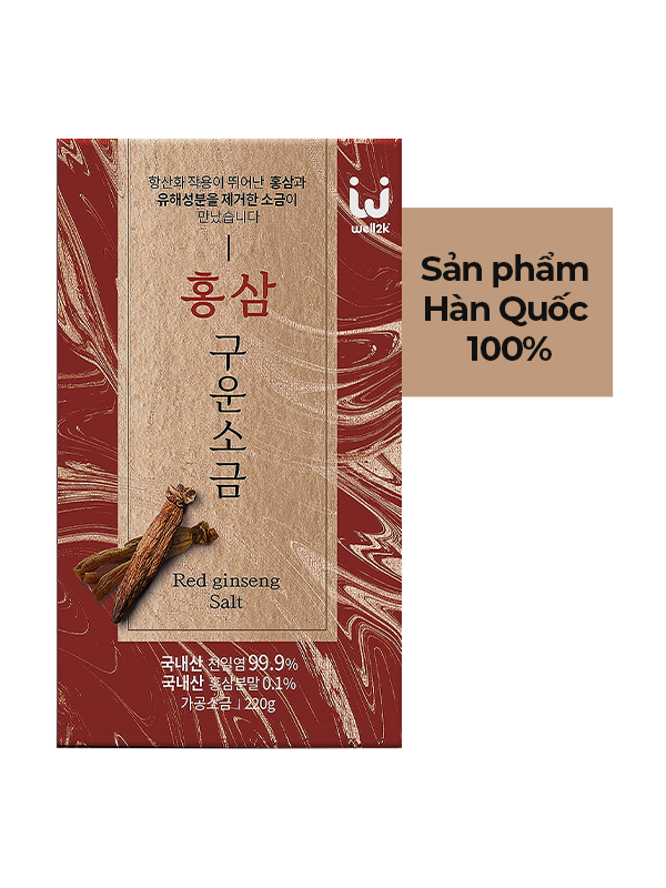 3.Nguyên liệu: Muối tinh khiết [muối biển 100% (Hàn Quốc)] 99,9%, bột hồng sâm 0,1% [hồng sâm (Hàn Quốc)].
